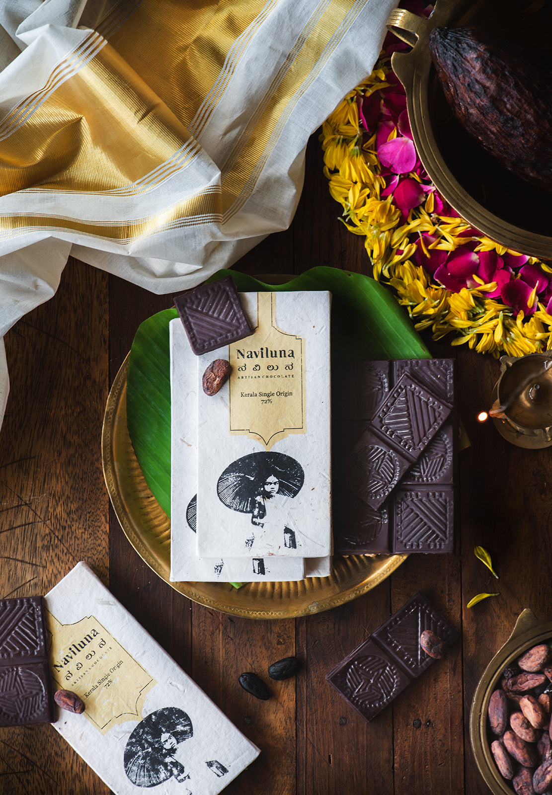 Naviluna artisan dark chocolate is hand-crafted at low temperatures to harness the greatest nutritional potential of each and every cacao bean, made bean-to-bar in small batches, showcasing the distinctive terroir and flavour of south Indian cacao.